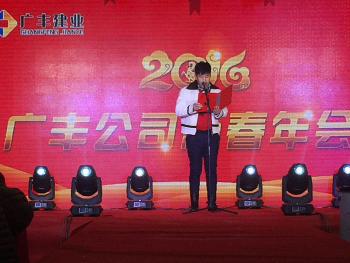 下午4點半,伴隨著新年的祝福聲、歡呼聲和主持人熱情洋溢的祝福聲,廣豐集團2016新春年會正式開始,集團公司董事長王曉軍先生首先致辭,向公司全體員工致以新春的問候和美好的祝福。